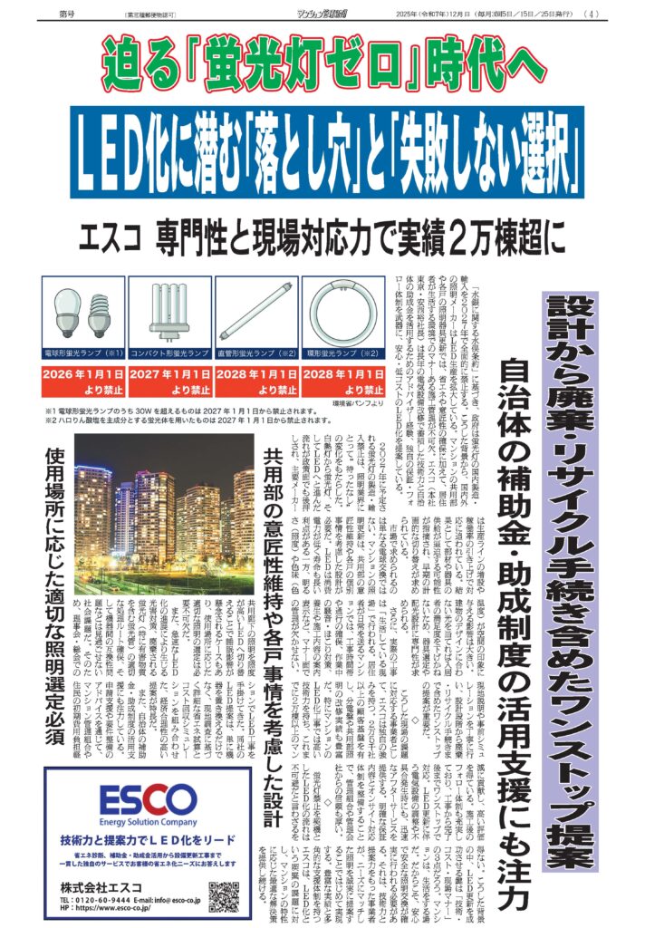 株式会社マンション管理新聞社(東京都中央区 社長:山本和広)が発行するマンション管理の専門紙『マンション管理新聞』の2026.1.15版に、照明の2027年問題に関する記事が掲載されました。