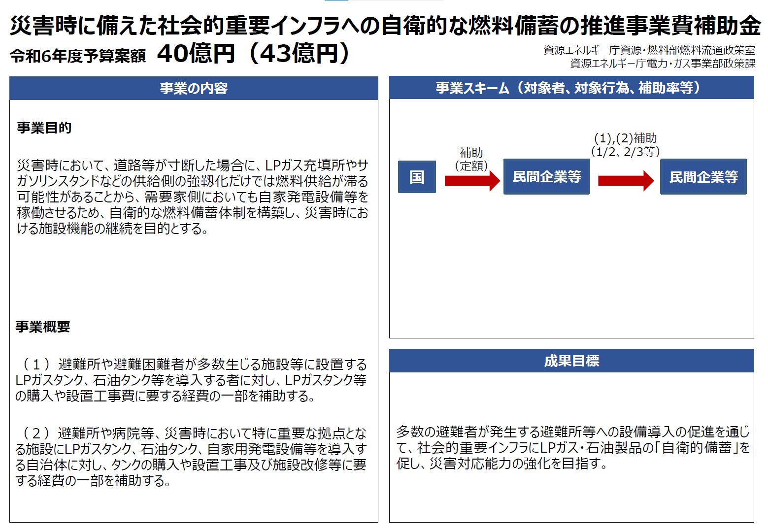 | (経済産業省)災害時に備えた社会的重要インフラへの自衛的な燃料備蓄の推進事業費補助金 |